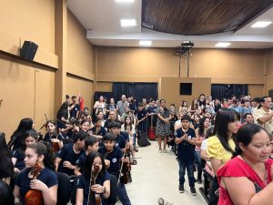 Los profesores Nélida Díaz, José Bareiro y Anabella Lorenzo, junto al director de la orquesta Diego Navarrete, guiaron cada presentación con compromiso y profesionalismo, acompañando el proceso de aprendizaje de cada alumno.