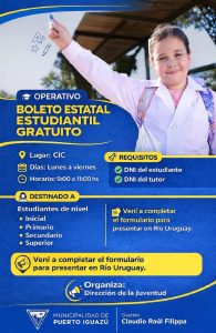 La Municipalidad de Puerto Iguazú informa a la comunidad que se encuentra en marcha el Operativo Boleto Estudiantil Misionero, una iniciativa destinada a facilitar el acceso al beneficio para estudiantes de todos los niveles educativos.